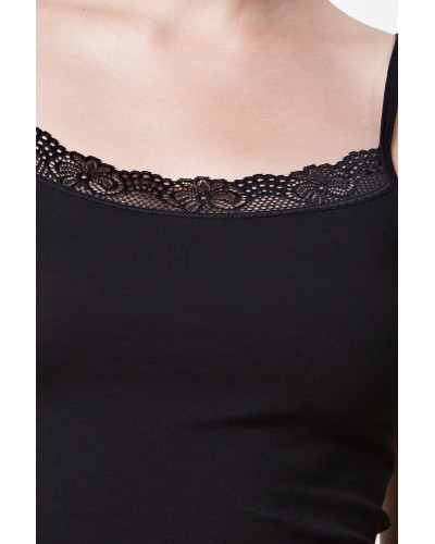 Женская классическая майка на узких бретелях, прилегающего покроя. Выполнена из высококачественного хлопка с добавлением эластана. Декольте декорировано кружевной эластичной лентой. Приятная к телу, комфортно облегает фигуру.