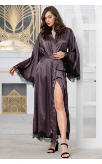 Длинный халат Mia-Amore с широкими рукавами длиной 3/4 выполнен из искусственного шелка рубинового цвета. Рукава халата декорированы по низу кружевом. Халат завязывается широким эффектным поясом, в боковых швах карманы.