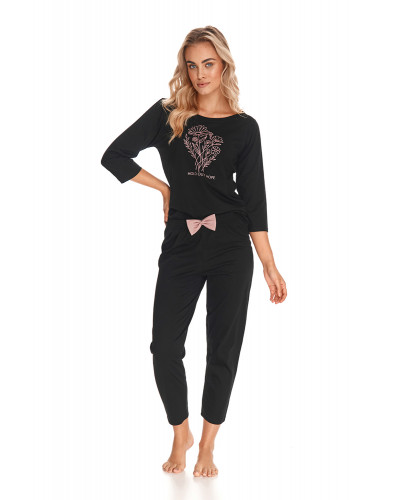 Пижама Alma выполнена из хлопкового полотна, состоит из лонгслива с рукавами 3/4 и зауженных брюк. Лонгслив с принтом свободного кроя с круглым вырезом горловины. Брюки на широкой мягкой резинке с декоративным бантом на талии. Пижама идеально подходит для сна и в качестве домашнего костюма.