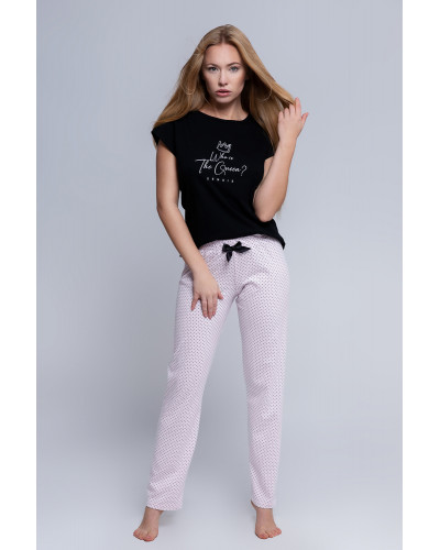 Хлопковая пижама Stephanie состоит из черной футболки и нежно-розовых брюк в черный мелкий горошек. Футболка свободного кроя, с короткими рукавами, декорирована надписью на груди. Брюки прямые, пояс на мягкой широкой резинке, украшены атласным бантиком. Идеальный вариант не только для сна, но и для домашнего отдыха.