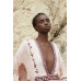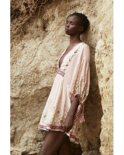 Короткое платье с открытой спиной, глубоким V-образным вырезом и длинными рукавами. Уникальные детали и рисунки ручной работы.